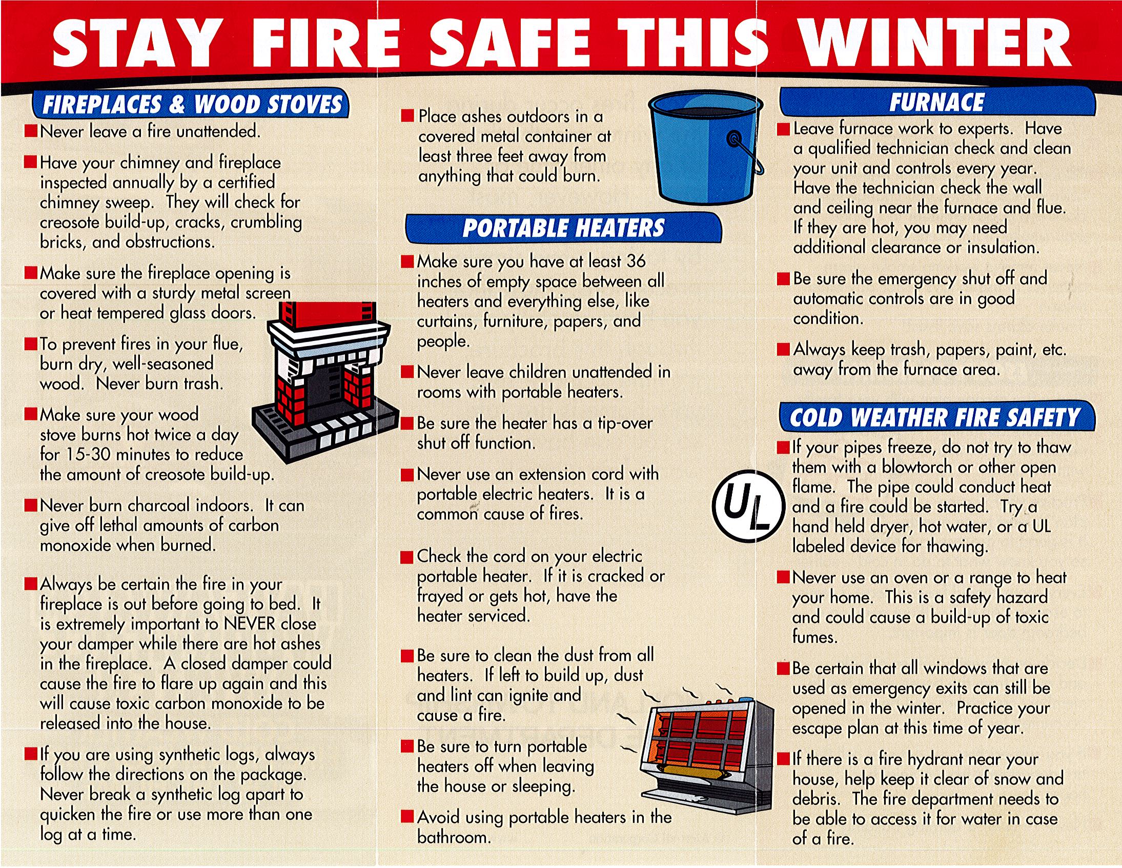 As the weather turns cooler and we beging using fireplaces, wood stoves, heaters and our furnaces there are some ways to make sure we are using these items safely. Click here for tips on keeping your chimneys, fireplaces and woodstoves safe. Click here for tips on using your portable heaters and furnaces safely along with additional information fireplaces & wood stoves.